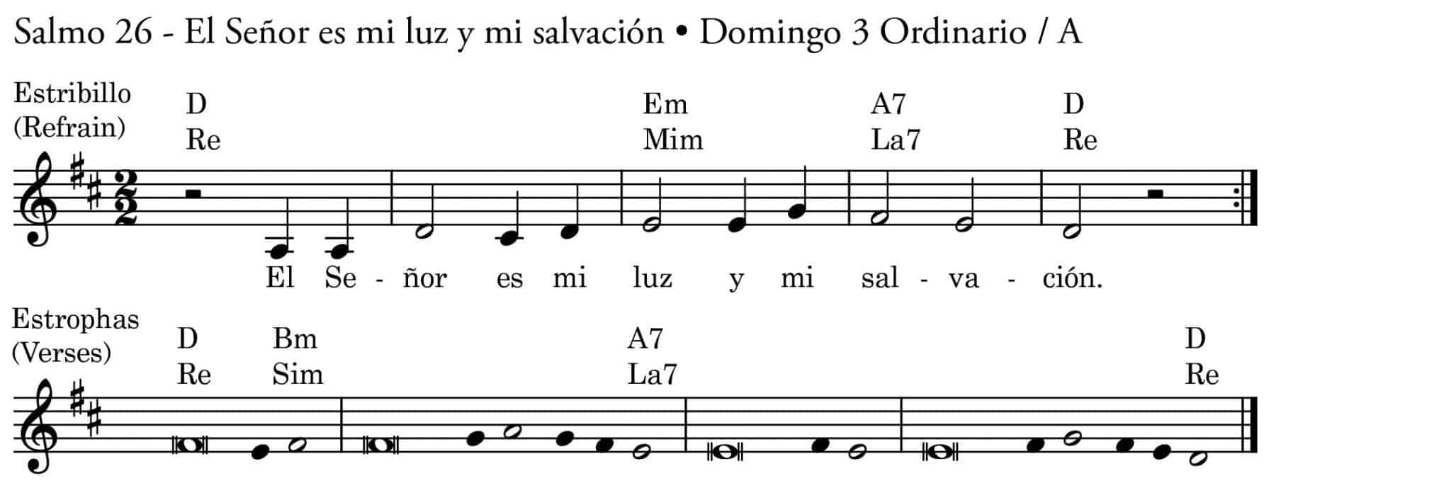 Salmo responsorial (responsorial psalm) for Domingo 3 Ordinario A – Salmo 26 - El Señor es mi luz y mi salvación. Responsorial Psalm 26 in Spanish for the 3rd Sunday in Ordinary Time Year A. Free download of sheet music at the following link. All the psalm verses are available.