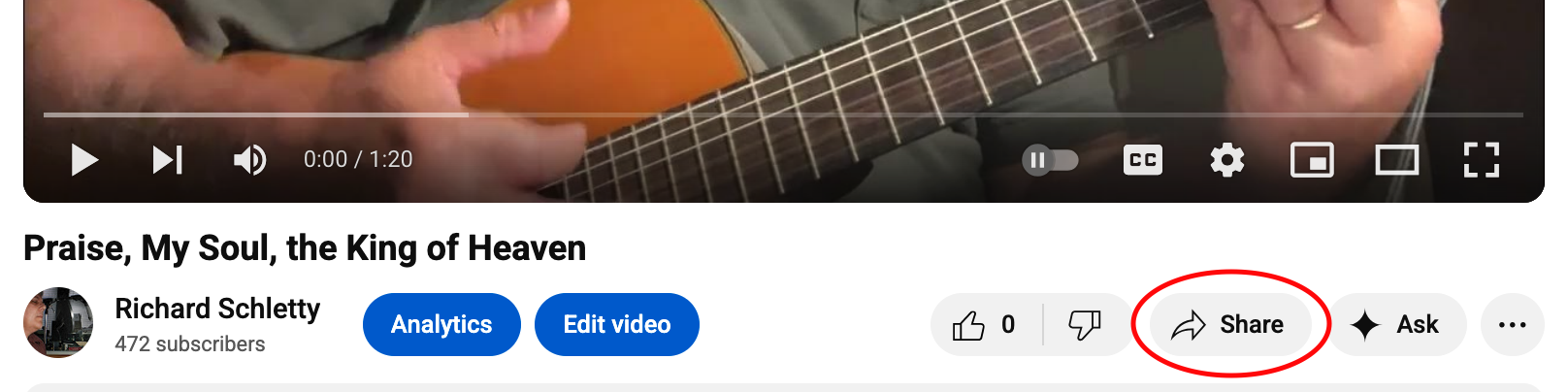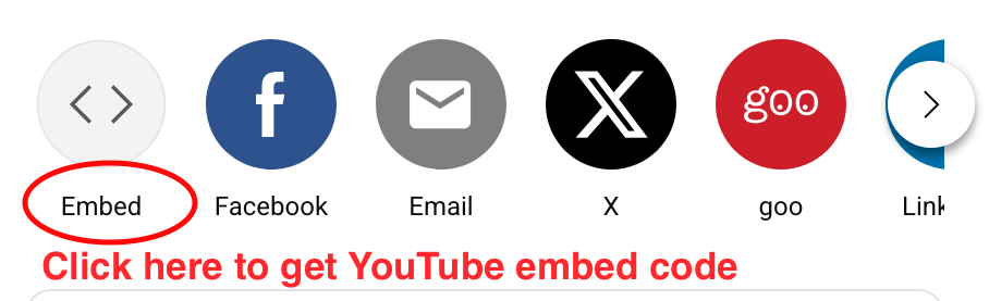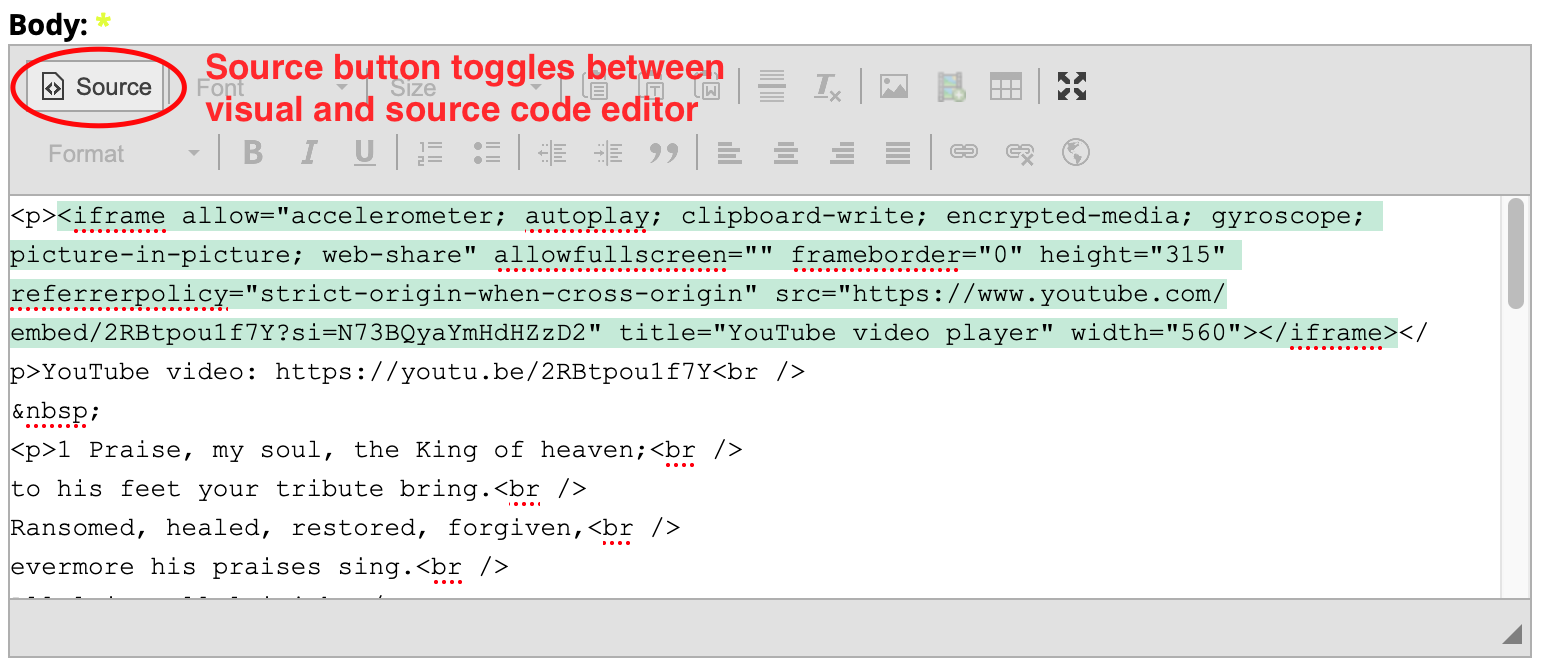 Q. How can I embed a YouTube video?First, go to your video which is published on YouTube. Click on the Share link and copy your Embed code to your clipboard, as shown in the screenshot below. Next, in your story or blog article editing window, click on the Source button in the top left of the formatting toolbar. The window changes to an HTML source code editor. Paste in your YouTube embed code which is enclosed in <iframe> tags, placing the code between <p> and </p> paragraph tags. Click on the Source button again to return to the visual (rich text) editor. Do not worry that the YouTube video does not preview in the visual editor. The video will appear when you publish your story or blog.